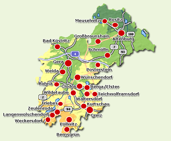 Altenburg | Auma | Bad Köstritz | Bad Klosterlausnitz | Berga | Eisenberg | Gera | Langenwetzendorf | Schmölln | Greiz | Ronneburg | Weida | Hohenleuben | Posterstein | Zeulenroda-Triebes | Wünschendorf | Bernsgrün | Pöllwitz | Weckersdorf | Meuselwitz | Rositz | Mohlsdorf | Reudnitz | Merkendorf | Ebersgrün | Dobareuth | Zickra | Hartmannsdorf | Caaschwitz | Teichwolframsdorf