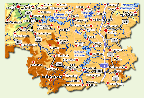 Altenberga | Apolda | Bad Berka | Bad Blankenburg | Bad Klosterlausnitz | Bad Kösen | Bad Köstritz | Bad Sulza | Blankenberg | Blankenhain | Bremsnitz | Bucha | Bürgel/Thalbürgel | Camburg | Crossen an der Elster | Dornburg | Drognitz | Eichenberg | Eisenberg | Freienorla | Großbockedra | Großleutersdorf | Großkochberg | Großpürschütz | Gumperda | Hermsdorf | Kahla | Kamsdorf | Kapellendorf | Kleinbockedra | Kleineutersdorf | Knau | Kranichfeld | Kromsdorf | Lehesten | Leutenberg | Jena | Linda | Lindig | Lippersdorf-Erdmannsdorf | Bad Lobenstein | Meuselbach | Mörsdorf | Neustadt/Orla | Oppurg | Orlamünde | Oßmannstedt | Plothener Teiche | Pößneck | Ranis | Reichenbach | Reinstädt | Remptendorf | Renthendorf | Rudolstadt | Röttelmisch | Saalburg-Ebersdorf | Saalfeld | Scheiditz | Schkölen | Schleifreisen | Schleiz | Schwarzburg | Schöngleina | Seitenroda | Serba | Silbitz | St. Ganglof | Stadtroda | Tautenhain | Tautenburg | Tonndorf | Triptis | Trockenborn-Wolfersdorf | Thüringer Meer | Uhlstädt | Waldeck | Weimar | Weißbach | Weißenborn | Wurzbach | Ziegenrück